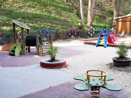 Zur Kindertagesstätte gehört zudem ein großes neuwertiges Außengelände, das als Spielplatz genutzt wird. Auf dem Spielplatz sind einige Bewegungs- und Spielanreize vorhanden: eine Schaufel, ein Spielhaus und der große Sandkasten. Andere Spielzeuge für Außengelände, wie Fahrräder, Bobycars und Sandspielzeug sind vorhanden.